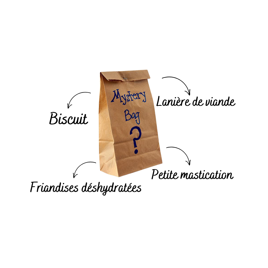 Le sachet découverte contient un biscuit, des friandises déshydratées, une lanière de viande & une petite mastication.